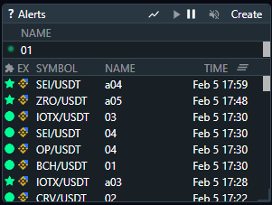 After you have created Alerts — you need to wait for alerts appearing in the console (when alert is triggered), then press on the alert name: the corresponding pair will be opened on the main Chart and you will see an alert icon near the candle.