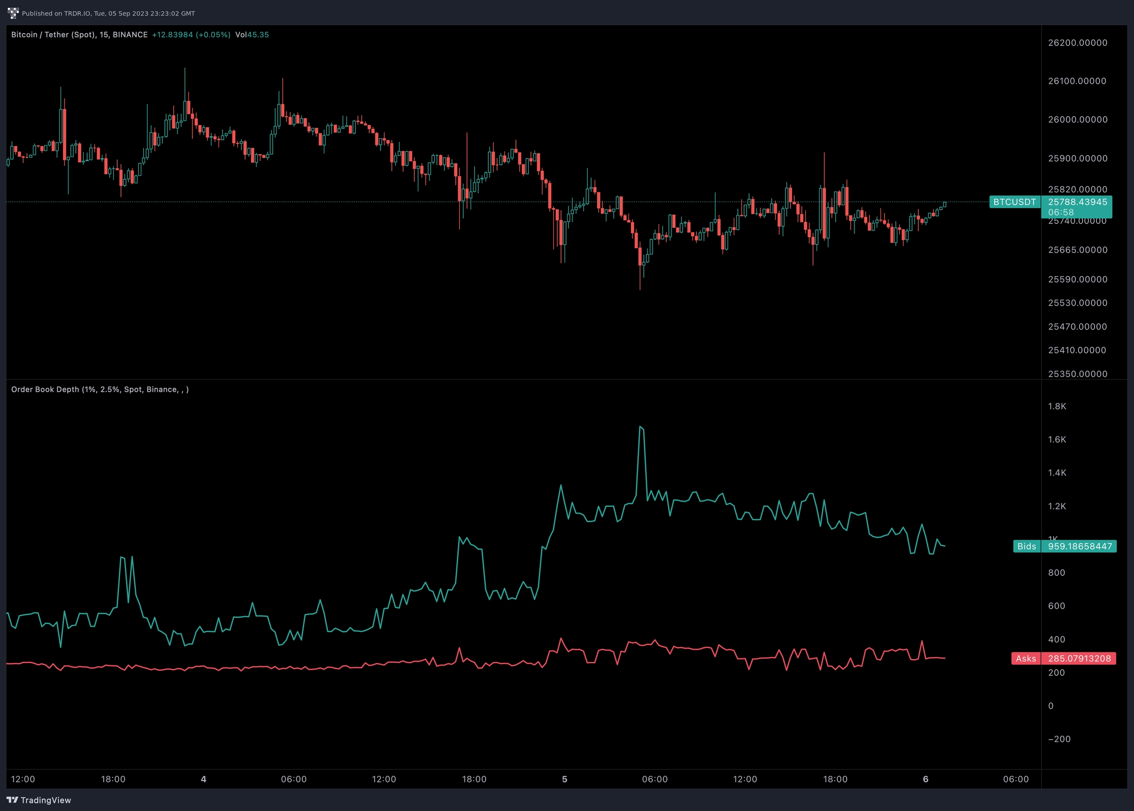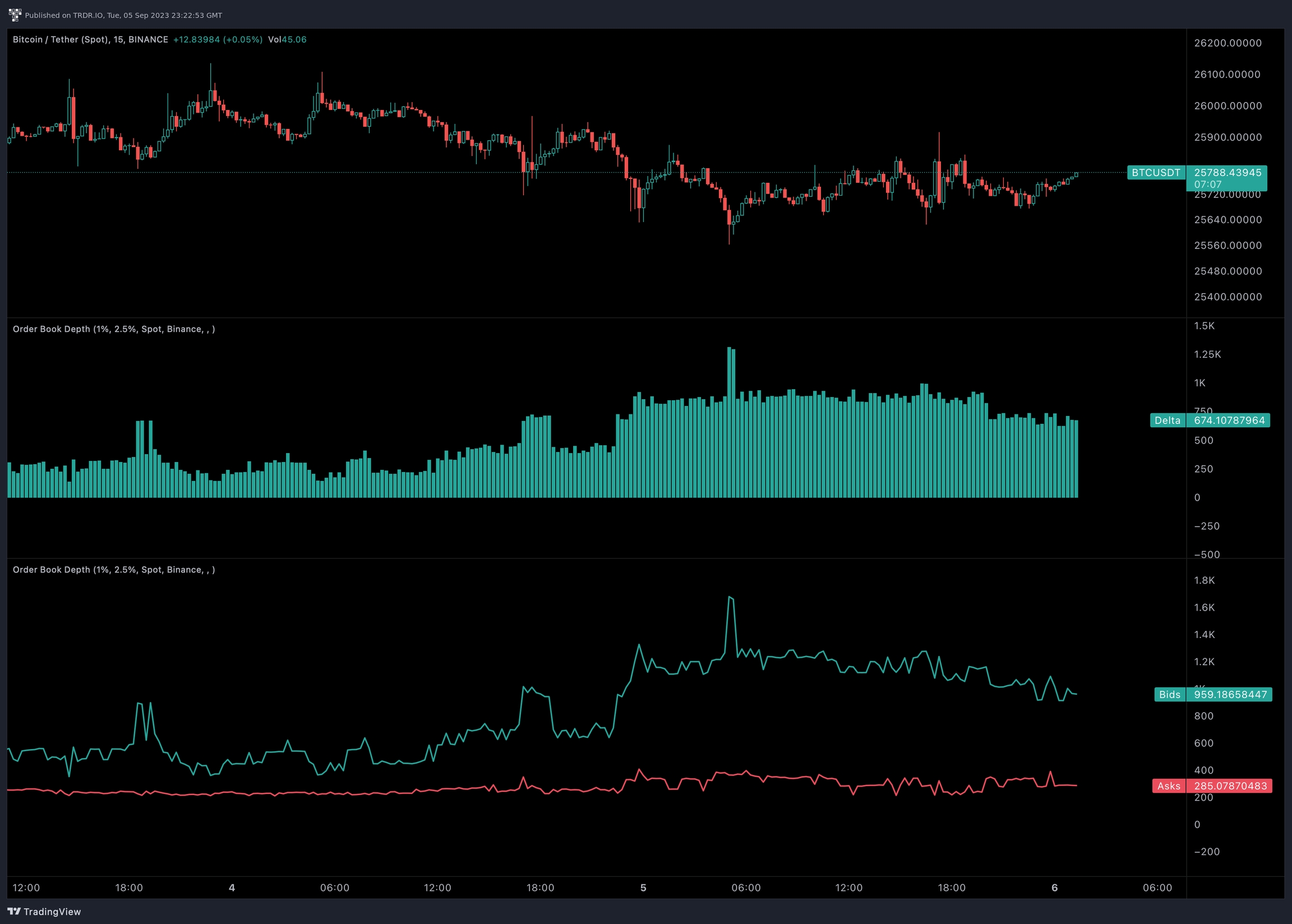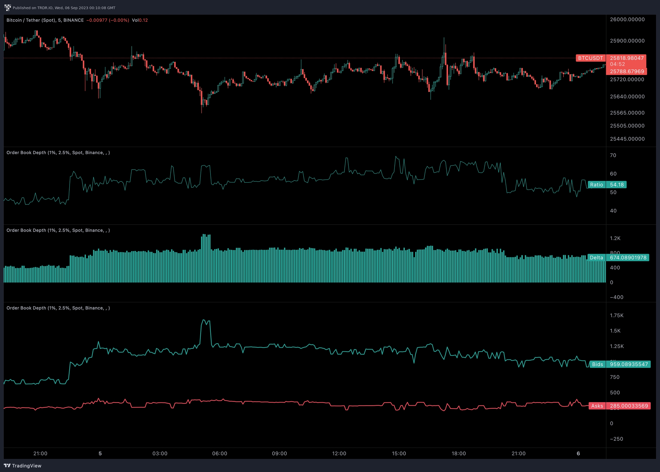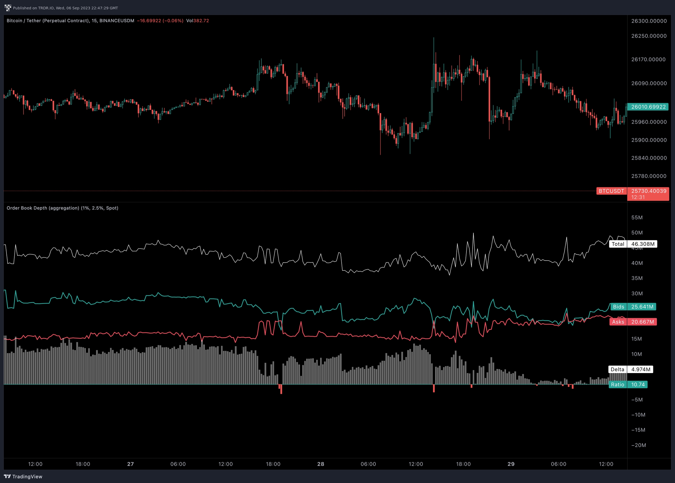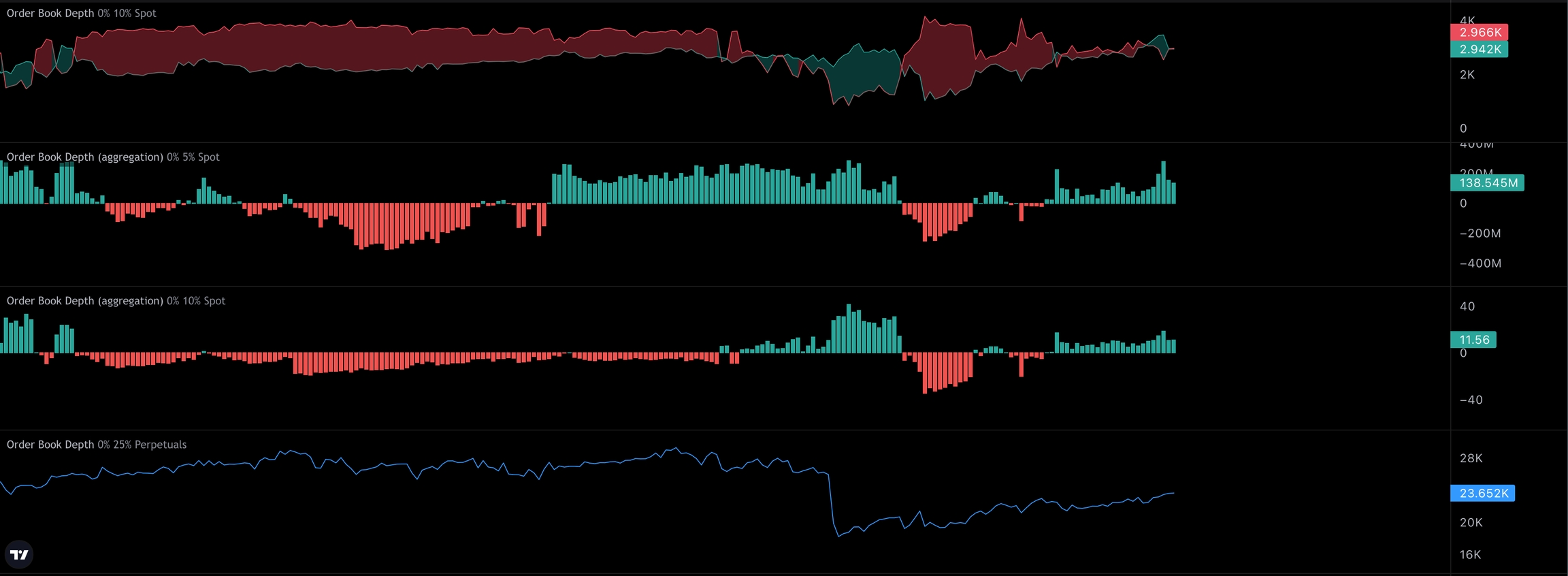 Below another example of spot + perpetuals, which paints a significantly different picture compared to the first example (spot). This explanation covers every function of the order book depth indicator.