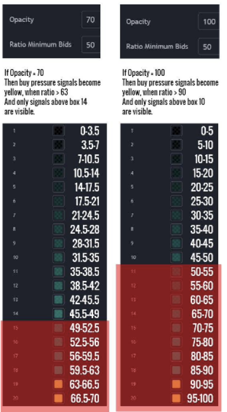 Adjust Ratios: Fine-tune the ratios to filter out noise and display only the most relevant signals. Default settings are Ratio Minimum Bids: 20, Ratio Minimum Asks: 20.