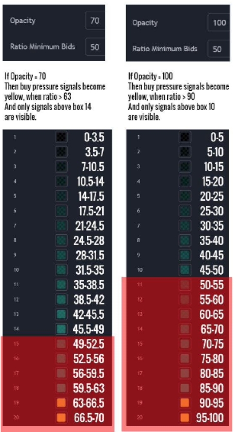 Color Your Ratios: Customize colors for specific ratios, making it easy to identify important levels. So it is 100 divided by 20 boxes = 5 per box, so if you want to highlight the ratios above 90 with yellow I change the color of box 19. Another example if you want the ratios above 70 to be yellow. You set the opacity cap at 100 there are 20 boxes so for 70 I select the 15th box.