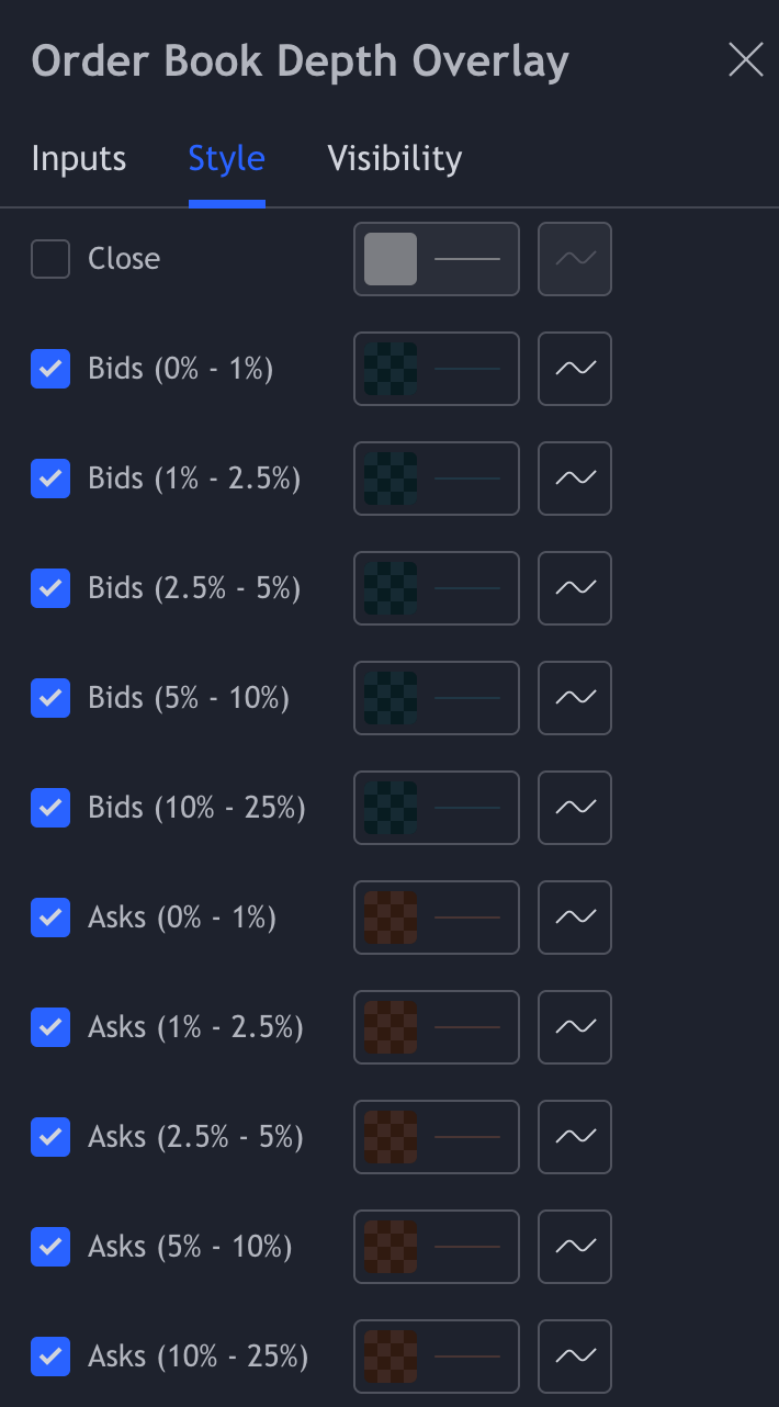 Select Bands: Select which depth lines you want to see. If you select a depth of 0-10% but turn of the 0-10% the bands. The indicator scale will change. If you like to have the bands at a true distance make sure you turn on the widest depth. In this case with a 0-10% depth, you need to keep the 5-10% bands turned on, for both the bids and the asks.