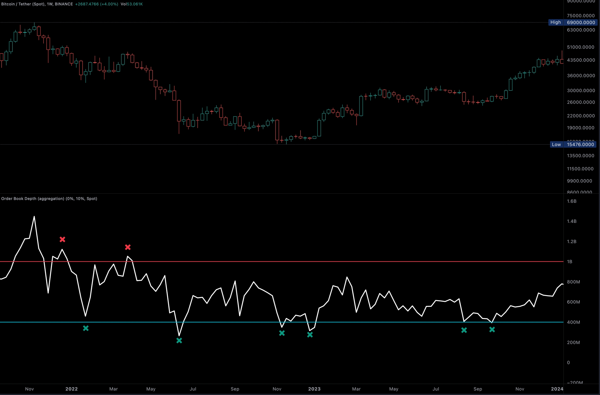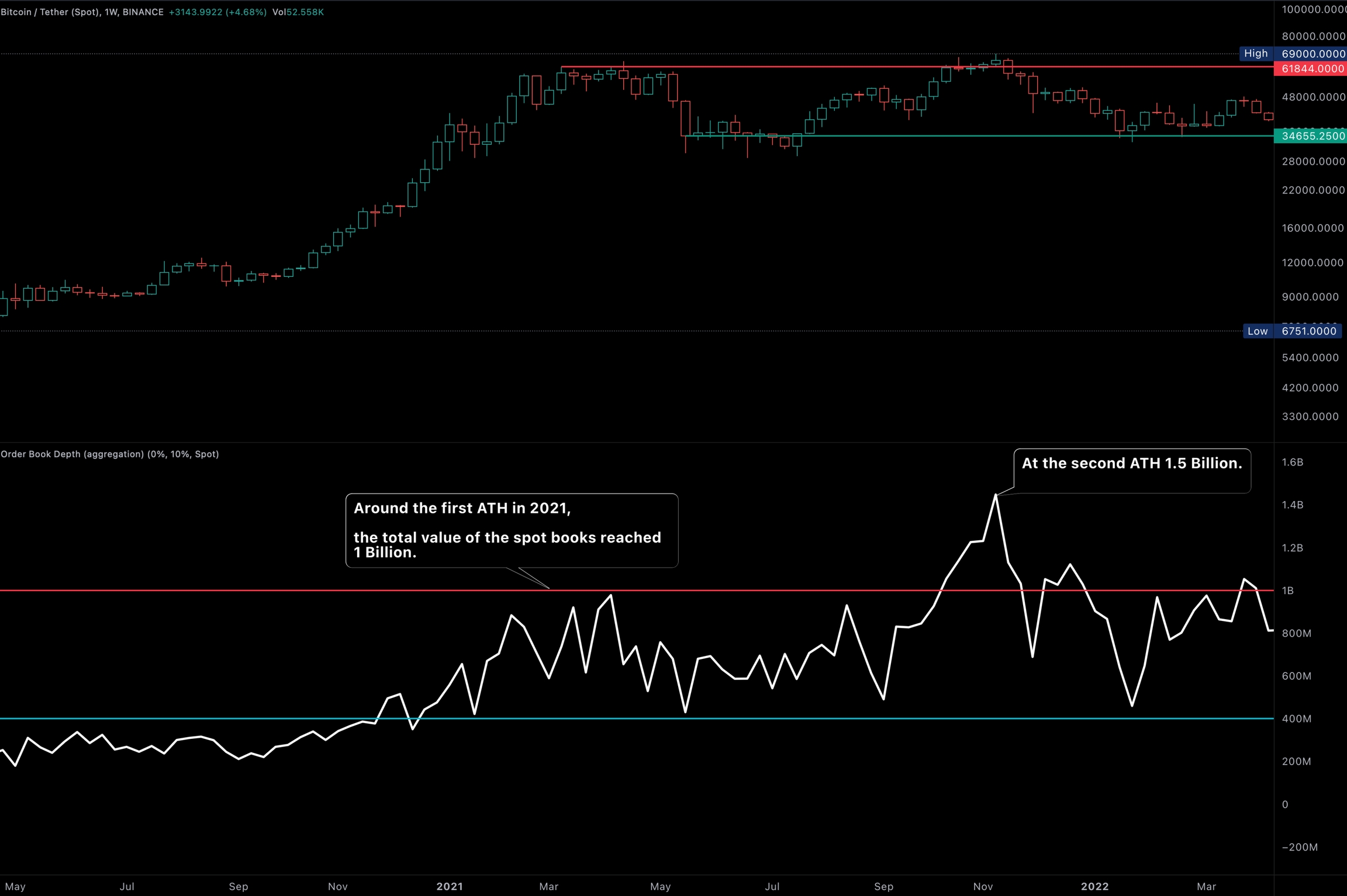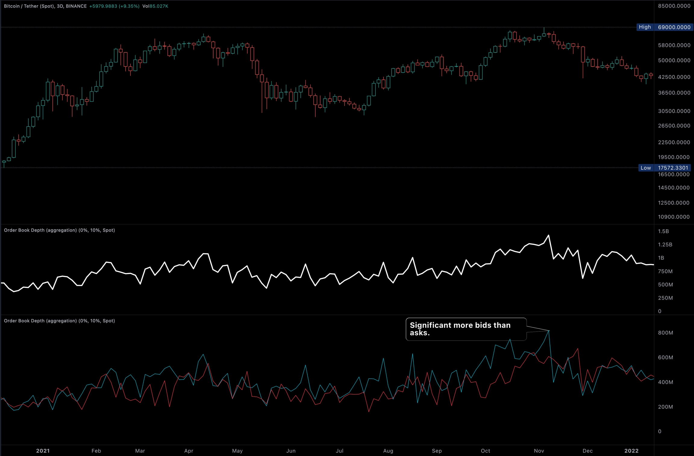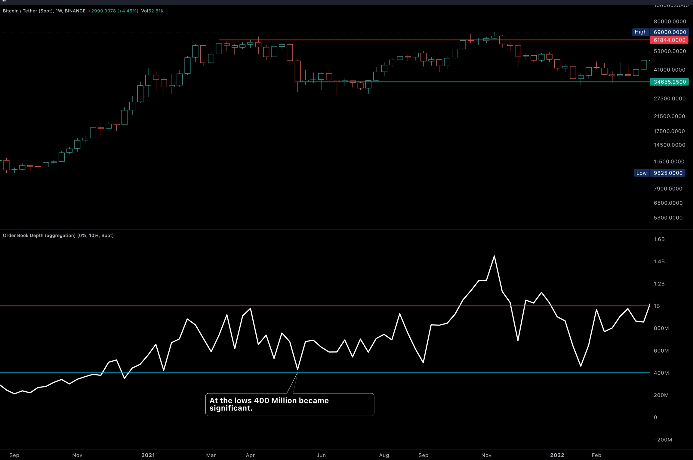 After the first cycle with this new dataset, it became clear that a high value is generally bearish, a low value bullish. Which was a surprise because you would think that more money in the order books is bullish. This could mean that big holders of these assets are selling when the books are thick enough, at the end of the day the biggest whales are making the tops. The ratios are great at measuring the difference between bids and asks, but it says nothing about absolute values. So this became a perfect addition to the overlays and order book depth, giving us traders are more broader view.