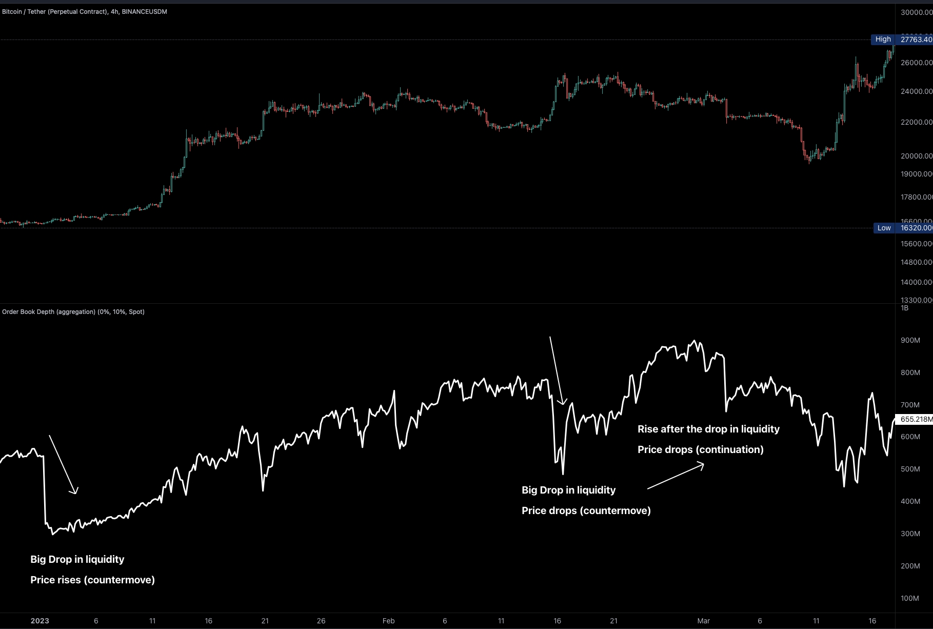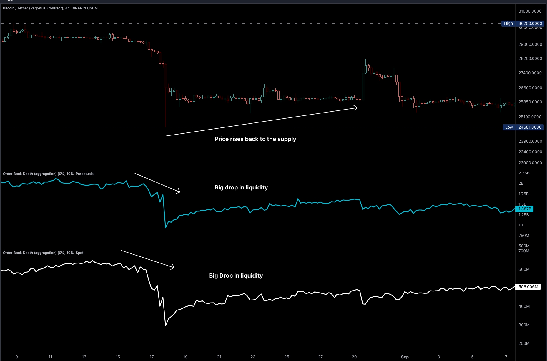 Another useful way of using this data, is monitoring the drops in liquidity. The concept is simple, we monitor for big changes in the totals of the order book depth totals. A big decrease = generally bullish a big rise bearish, but there will also be scenarios where the opposites occur. The golden rule = in both scenarios price will reverse. If price rises and liquidity drops a pullback (and the other way around) is likely because the books are getting empty. So price needs to come back to the demand or supply. Lets look at some big drops on a high time-frame.