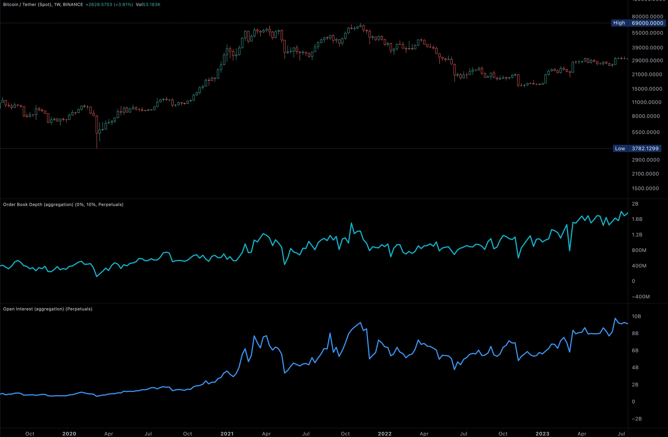 So what about Perpetual order books? They are less significant because there will be liquidity added according to the open interest. Meaning if the price drops and lots of shorts chase the price, market makers will provide liquidity accordingly to the open interest. As we can see in the image below.