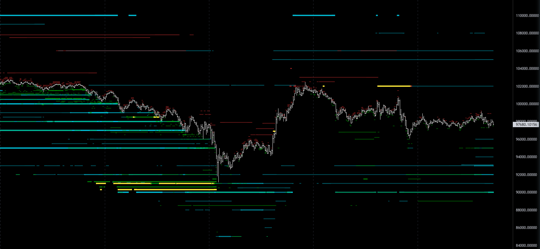 Visible Range Only: When enabled, this option calculates relative sizing and visual styling (such as line thickness and colors) based solely on order book levels within the currently visible chart range. This ensures that visual contrast remains optimal for the data currently in view, rather than being distorted by off-screen historical extremes. Enabling this option is highly recommended.
