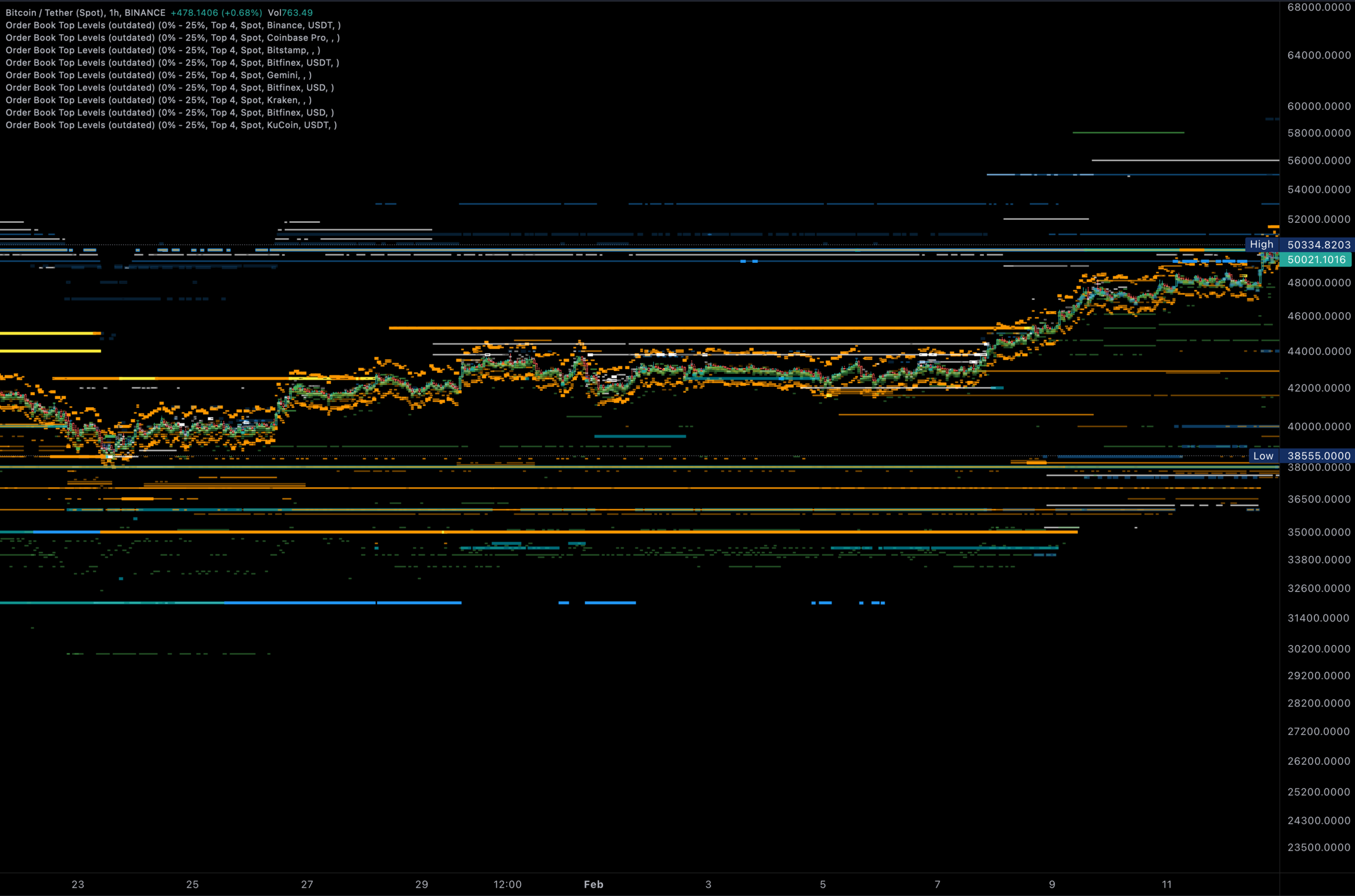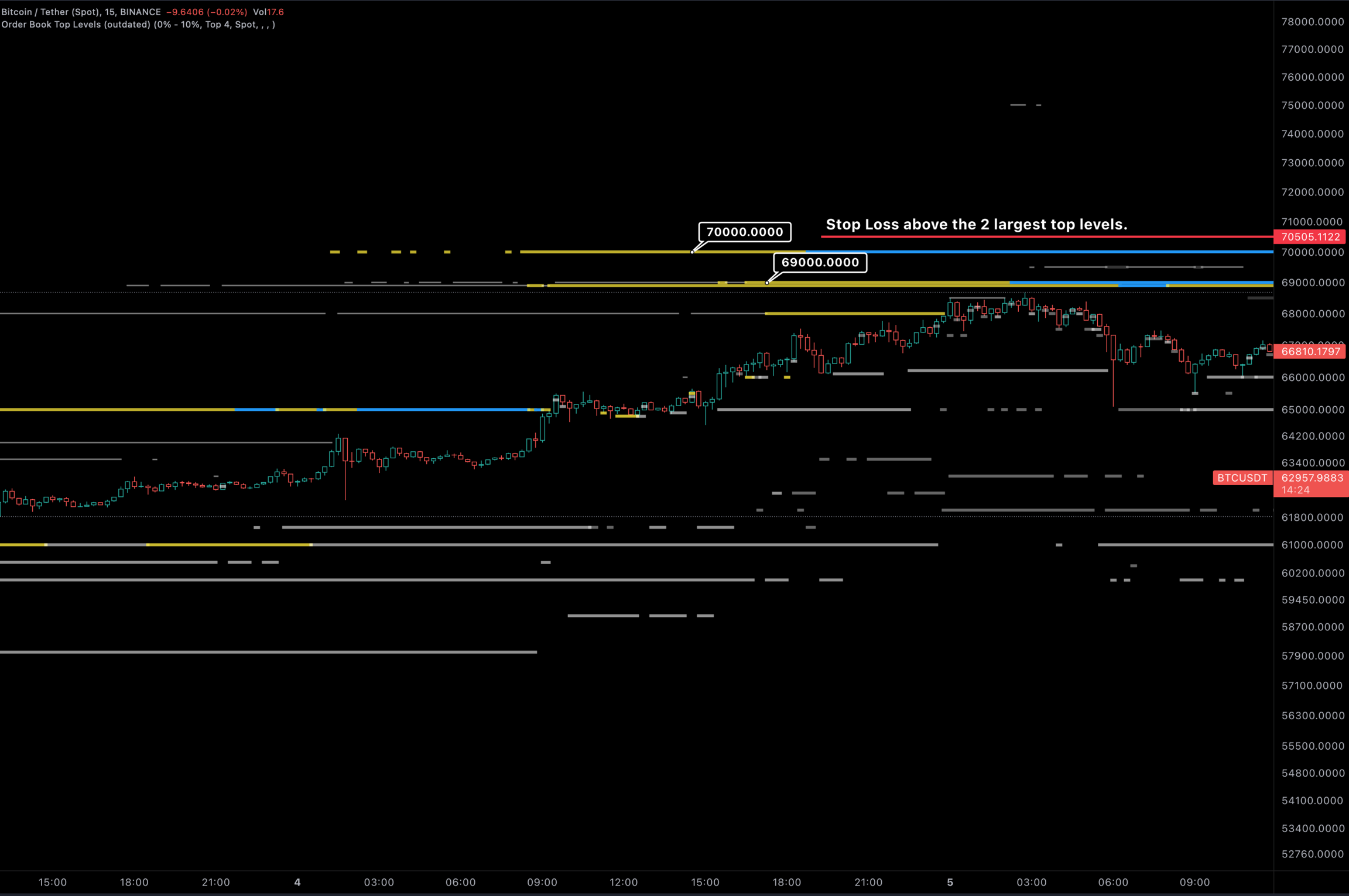 Think of the Top Levels Indicator as an X-ray into the order book. It presents a real-time heatmap of the largest active orders (up to the top 10 buy and sell orders) within the visible range of the selected exchange's order book. This allows traders to: