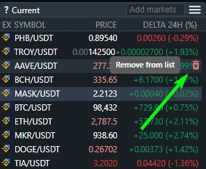 Sorting Option Click on any column header to sort your markets by Exchange, Symbol, Price, Delta 24H% (current price compared to the price that was observed on the "Daily close" of the previous day) or % change. This is useful for quickly spotting the biggest movers or assets trading on specific exchanges.